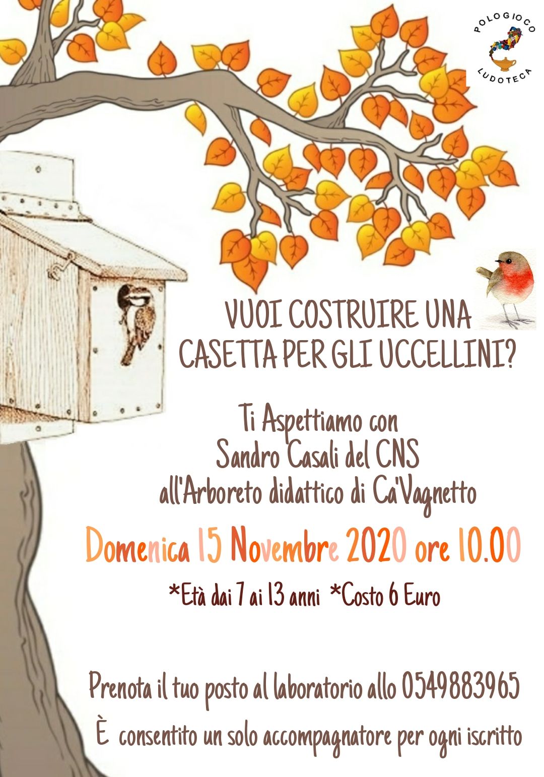 - Domenica 15 novembre 2020 ore 10.00: costruzione di una casetta per gli uccellini all'Arboreto didattico di Ca' Vagnetto con Sandro Casali del CNS.