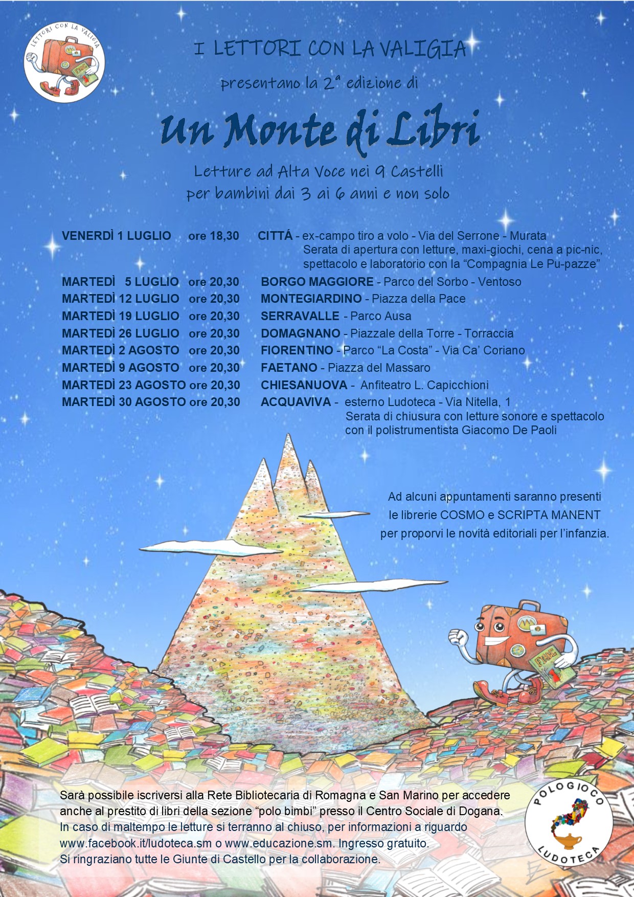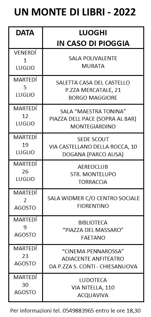 In caso di maltempo le letture si svolgeranno al chiuso, per informazioni a riguardo www.facebook.t/ludoteca.sm oppure www.educazione.sm.